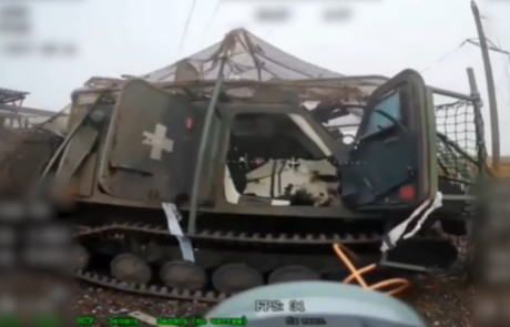 Zničené britsko-švédské obojživelné obrněné vozidlo ukrajinské armády označené symbolem, který používal nacistický Wehrmacht při napadení Polska, tzn. bílým trámovým křížem zavedeným rozkazem O.K.H. AHA/In 6 (I.Kav./IV) Nr. 3003/39 g. v roce 1939