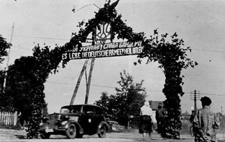 Transparent s nápisy v ukrajinštině Sláva Ukrajině! Sláva Banderovi! a s nápisem v němčině ES LEBE DIE DEUTSCHE ARMEE! HEIL HITLER! AŤ ŽIJE NĚMECKÁ ARMÁDA! HEIL HITLER!